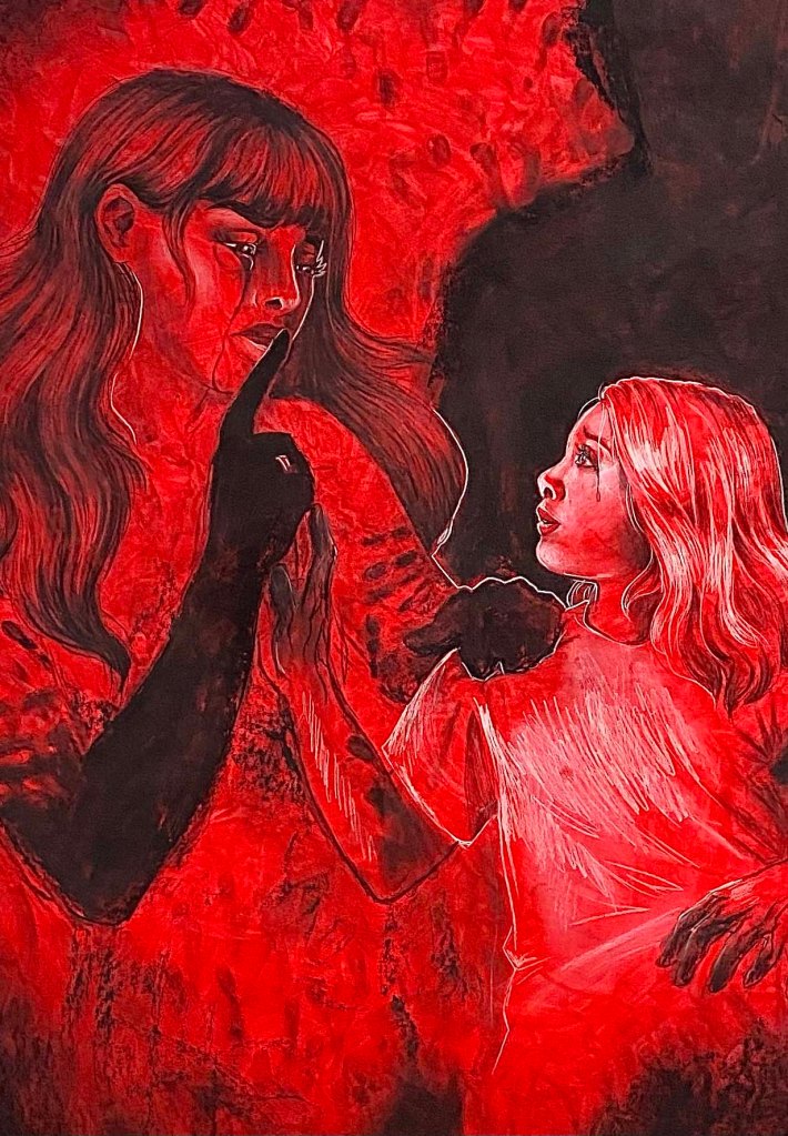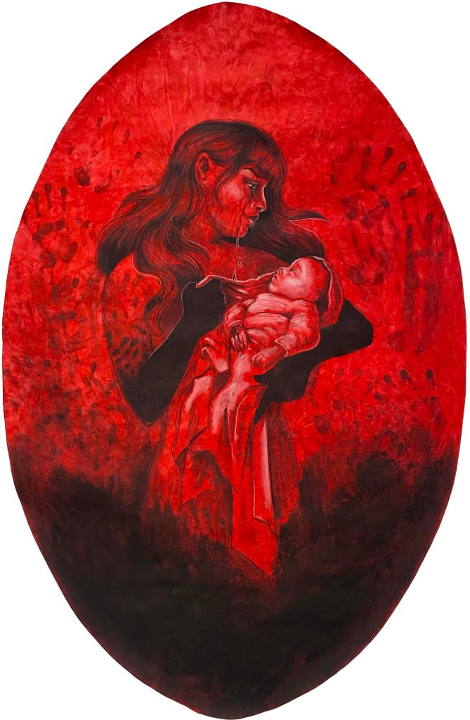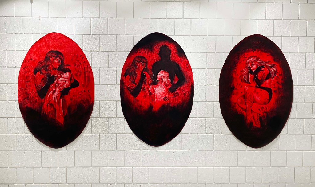 Mother’s Touch, 2023. Black and white charcoal on red stained paper. Three pieces at 56″ x 36″.