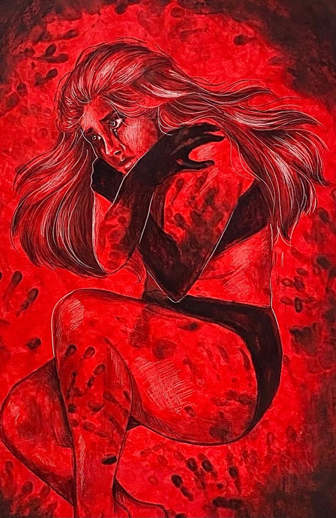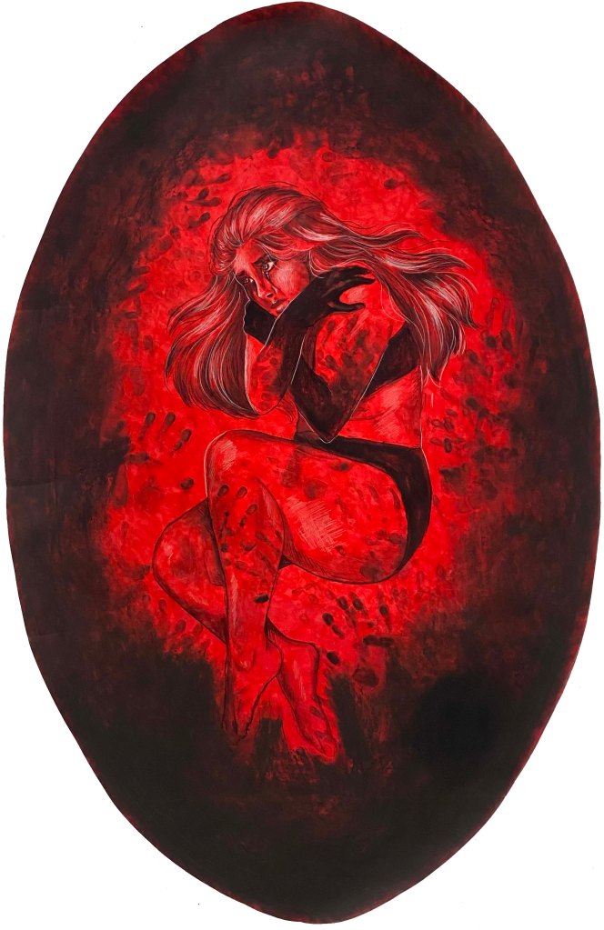 My work has become increasingly more personal from project to project, with this being my most recent project. Here we can see a triptych focused around motherhood, and more specifically the role that my own mother had in my life. The progression of the mother figure throughout these drawings shows how she begins the cycle in the “traditional” position of motherhood, holding her baby lovingly despite her own anguish. This pain can be seen spreading to the child, the marks and handprints of abuse and experiences slowly building, until the mother is gone and only the painful marks remain. This represents my experience with my mother, where as a mother typically protects and nurtures, mine normalized abuse in my life and left scars on my mind that I now carry into adulthood.